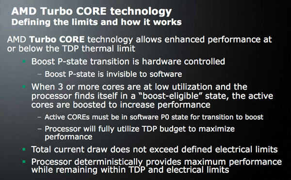 AMD has recently provided a slide deck that sheds new light on “Turbo CORE,” the company’s upcoming match to Intel’s Turbo Boost, both of which increase the clockspeed of active CPU cores when the thermals of the chip permit.